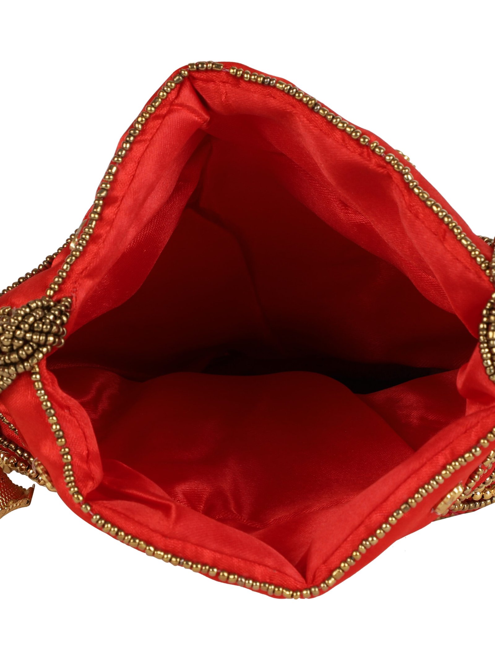 Red and gold-toned embellished potli clutches Has wrist loop 1 main compartment with drawstring closure Size & Fit Height: 18